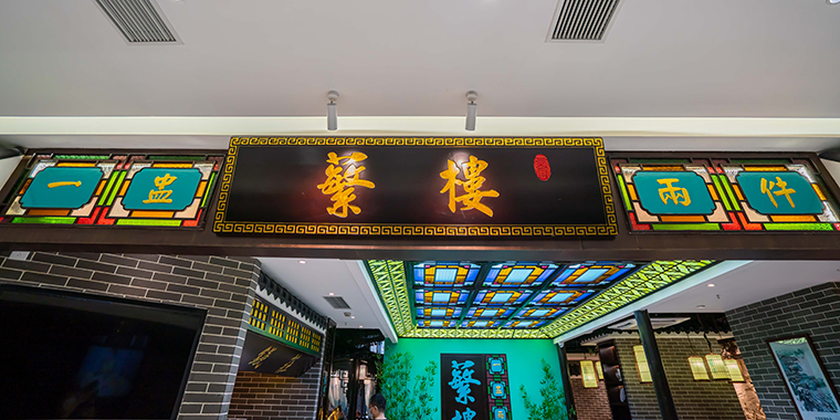 空間中我們則用西關常見的騎樓、灰磚、鑊耳山墻、趟門,把百年傳承的文化韻味裝飾出來,讓消費者身臨其境,感受蘩樓的西關點心文化。這是把