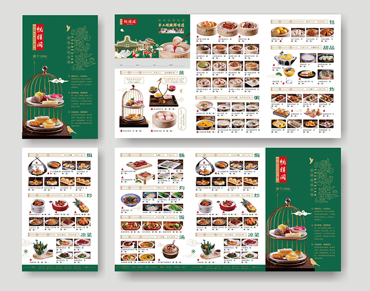 菜單價格避免使用常規排版版式,盡量弱化代替,將價格數字縮小,金錢標志¥20簡化為20.價格后面標明菜品的單位。價格代替,例如品深設計做的悅得閑、寶粵樓、蘩樓等廣式點心的菜單,都不放價格,用小點、大點、中點、特點、頂點、超點、精點、佳點、優點來代替。在底部統一將小點、大點、中點、特點、頂點、超點、精點、佳點、優點標上價格。菜品與價格隔離就會減少價格對顧客的影響,不經意間放大了顧客的消費金額。